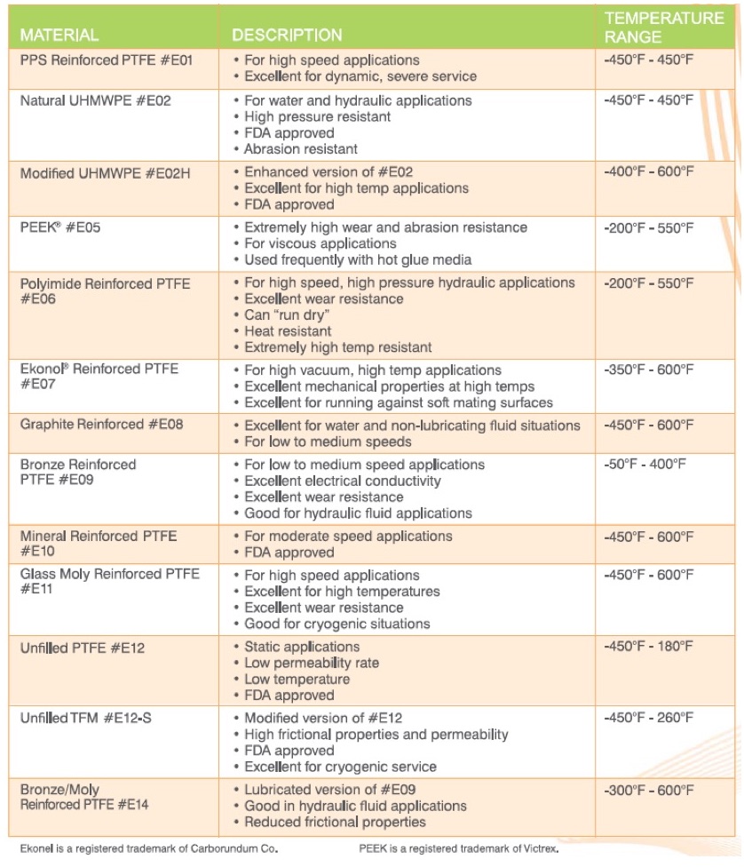 典型的密封产品有下面材料制成PTFE and PTFE compounds 、UHMWPE